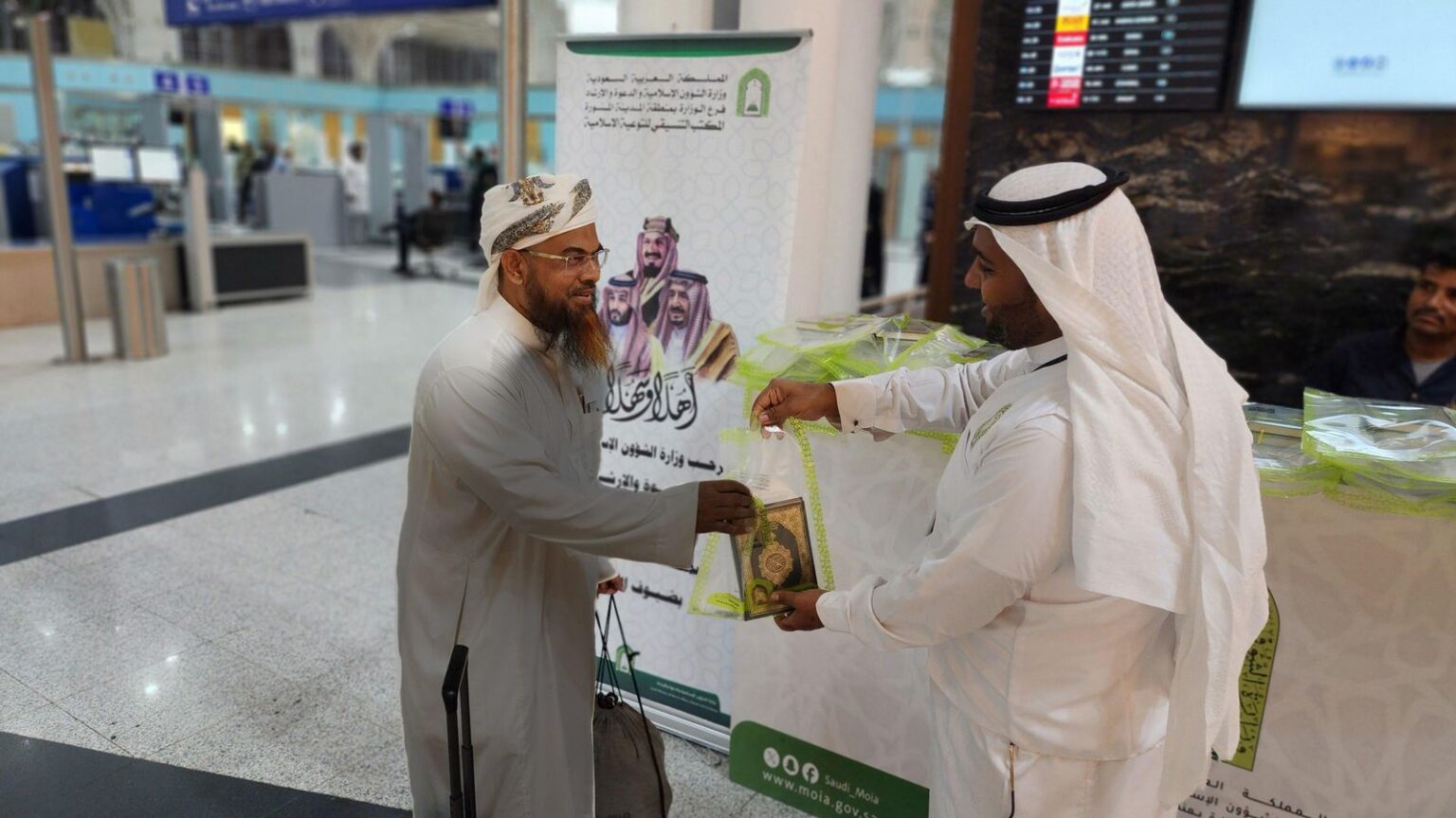حيث يجري توزيع المصاحف ضمن جدول زمني وعلى مدار الساعة ، لضمان وصول هذه الهدية المباركة إلى كافة حجاج بيت الله الحرام من مختلف الجنسيات المغادرين جواً عبر مطار الأمير محمد بن عبدالعزيز الدولي بالمدينة المنورة ومطار الامير عبدالمحسن الإقليمي بينبع،.