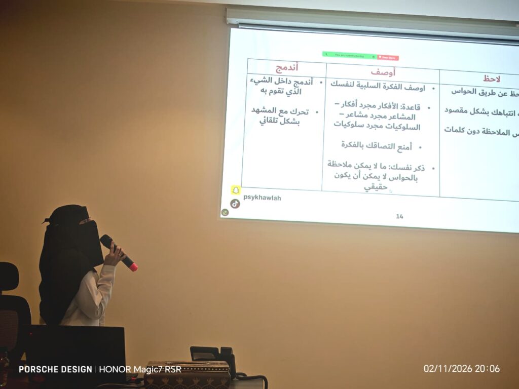 وقد عكست طريقة التقديم قدرة العنزي على التحرر من الأساليب النمطية في التعليم والعلاج، إذ تعاملت مع القلق بوصفه تجربة إنسانية متعددة الأبعاد، لا قالباً واحداً يصلح للجميع، مؤكدة على أهمية انسجام التدخل النفسي مع خصوصية كل حالة على حدة، ومع النموذج الداخلي لكل شخص.
